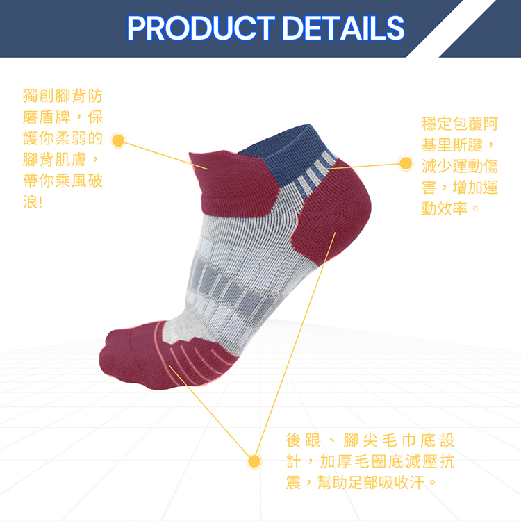 三倍除臭棉,厚底毛巾襪,全襪身萊卡彈性紗使用。