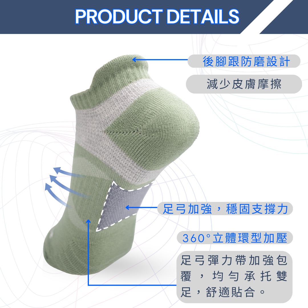 整體壓力用三段漸進式壓力設計,並於腳尖使用義大利無痕縫線。